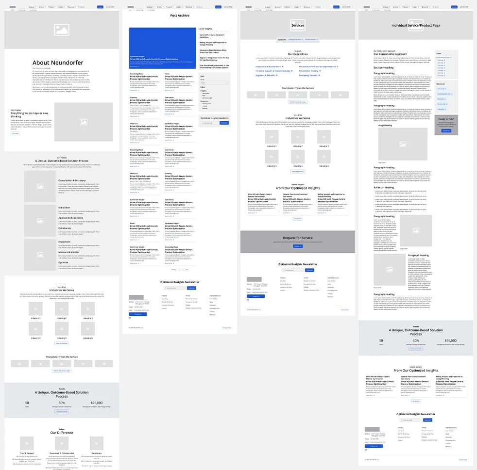 One of the primary challenges of this project was strategically organizing the website’s pages and content to enhance usability. To tackle this, we first gained an in-depth understanding of Neundorfer’s diverse product and service offerings. This involved close collaboration with the client and conducting extensive market research, which informed our development of an optimized content structure that became the foundation for our wireframing and design process.